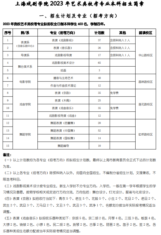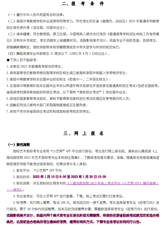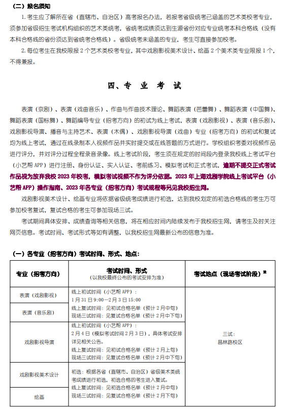 上海戏剧学院2023年艺术类校考专业本科招生简章